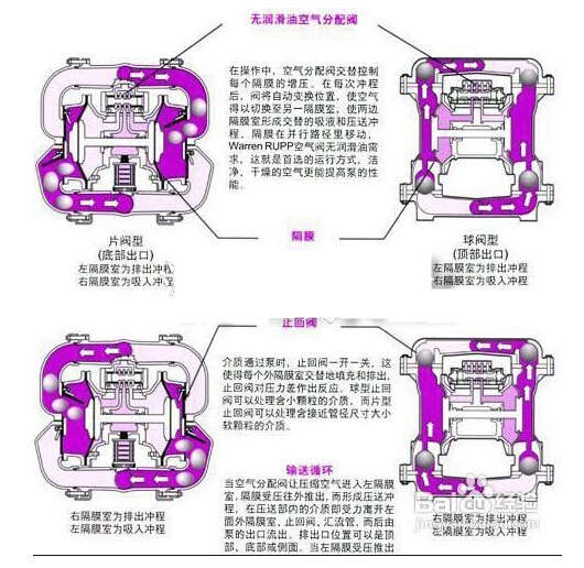 氣動隔膜泵是靠氣壓工作的機械。它將氣源從泵進氣口輸入后通過導向閥和氣閥總成交替改變氣流方向來交替推動左右隔膜使之吸料和出料,同時閥球隨料的進出而打開和關閉來配合一個工作循環的完成。只要泵內部件該密閉的密閉,該暢通的暢通,泵就能循環往復不停工作。在泵正常工作下,根據帕斯卡原理可知,泵頻率的快慢,力的大小在受力面積隔膜一定的情況下取決于氣源壓強的大小。